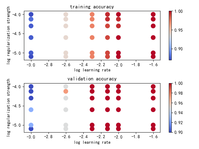for k in results.keys(): lr, reg = k train_acc, val_acc = results[k] print('lr = %f, reg = %f, train_acc = %f, val_acc = %f' % (lr, reg, train_acc, val_acc))