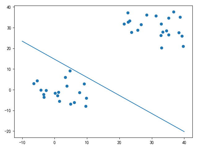 x = np.linspace(-10, 40, num=200) y = (-x * w[0] - b) / w[1] plt.plot(x, y)