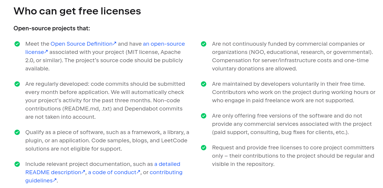 登录官网Licenses for Open Source Development - Community Support可以查看Jetbrains对于开源项目申请的要求,主要是