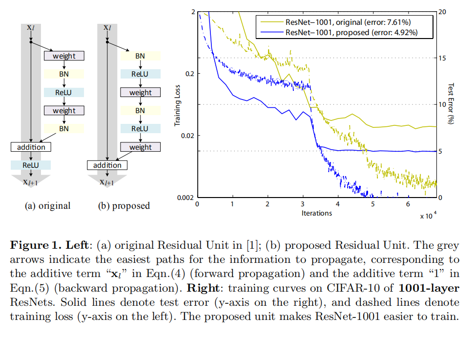 , we view the activation functions (ReLU and BN [8]) as “pre-activation” of the weight layers, in contrast to conventional wisdom of “post-activation”. This point of view leads to a new residual unit design, shown in (Fig. 1(b)). Based on this unit, we present competitive results on CIFAR-10/100 with a 1001-layer ResNet, which is much easier to train and generalizes better than the original ResNet in [1]. We further report improved results on ImageNet using a 200-layer ResNet, for which the counterpart of [1] starts to overfit. These results suggest that there is much room to exploit the dimension of network depth, a key to the success of modern deep learning.