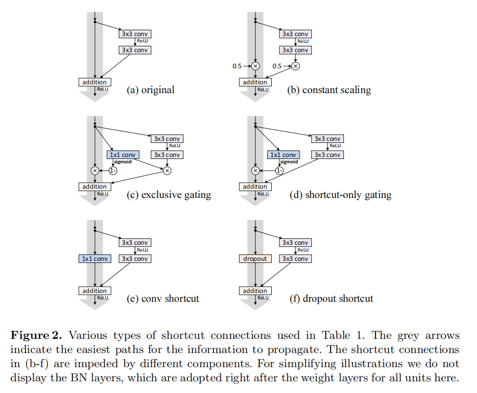 As indicated by the grey arrows in Fig. 2, the shortcut connections are the most direct paths for the information to propagate. Multiplicative manipulations (scaling, gating, 1×1 convolutions, and dropout) on the shortcuts can hamper information propagation and lead to optimization problems.
