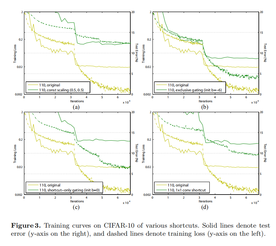 for all shortcuts (Fig. 2(b)). We further study two cases of scaling : (i) is not scaled; or (ii) is scaled by a constant scalar of , which is similar to the highway gating [6,7] but with frozen gates. The former case does not converge well; the latter is able to converge, but the test error (Table 1, 12.35%) is substantially higher than the original ResNet-110. Fig 3(a) shows that the training error is higher than that of the original ResNet-110, suggesting that the optimization has difficulties when the shortcut signal is scaled down.