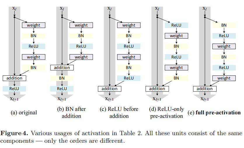 an identity mapping, which is done by re-arranging the activation functions (ReLU and/or BN). The original Residual Unit in [1] has a shape in Fig. 4(a) — BN is used after each weight layer, and ReLU is adopted after BN except that the last ReLU in a Residual Unit is after elementwise addition ( = ReLU). Fig. 4(b-e) show the alternatives we investigated, explained as following.