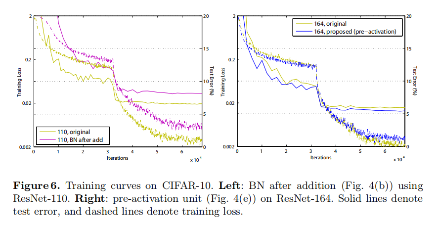 Reducing overfitting. Another impact of using the proposed pre-activation unit is on regularization, as shown in Fig. 6 (right). The pre-activation version reaches slightly higher training loss at convergence, but produces lower test error. This phenomenon is observed on ResNet-110, ResNet-110(1-layer), and ResNet-164 on both CIFAR-10 and 100. This is presumably caused by BN’s regularization effect [8]. In the original Residual Unit (Fig. 4(a)), although the BN normalizes the signal, this is soon added to the shortcut and thus the merged signal is not normalized. This unnormalized signal is then used as the input of the next weight layer. On the contrary, in our pre-activation version, the inputs to all weight layers have been normalized.