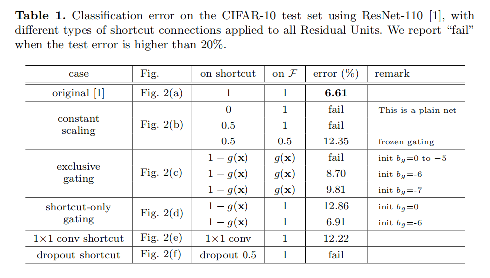 , the experiments in this section are all based on = ReLU as in [1]; we address identity f in the next section. Our baseline ResNet-110 has 6.61% error on the test set. The comparisons of other variants (Fig. 2 and Table 1) are summarized as follows: