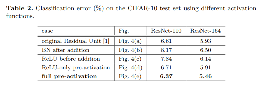 We experiment with two such designs: (i) ReLU-only pre-activation (Fig. 4(d)), and (ii) full pre-activation (Fig. 4(e)) where BN and ReLU are both adopted before weight layers. Table 2 shows that the ReLU-only pre-activation performs very similar to the baseline on ResNet-110/164. This ReLU layer is not used in conjunction with a BN layer, and may not enjoy the benefits of BN [8].