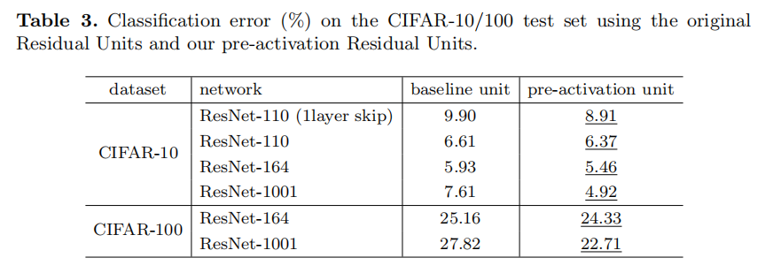Somehow surprisingly, when BN and ReLU are both used as pre-activation, the results are improved by healthy margins (Table 2 and Table 3). In Table 3 we report results using various architectures: (i) ResNet-110, (ii) ResNet-164, (iii) a 110-layer ResNet architecture in which each shortcut skips only 1 layer (i.e., a Residual Unit has only 1 layer), denoted as “ResNet-110(1layer)”, and (iv) a 1001-layer bottleneck architecture that has 333 Residual Units (111 on each feature map size), denoted as “ResNet-1001”. We also experiment on CIFAR-100. Table 3 shows that our “pre-activation” models are consistently better than the baseline counterparts. We analyze these results in the following.