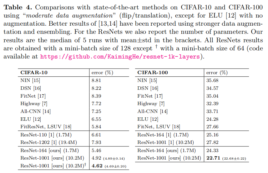 作用于CIFAR的ResNet-164/1001使用[1]中的bottleneck残差单元结构.比如,ResNet-110中的