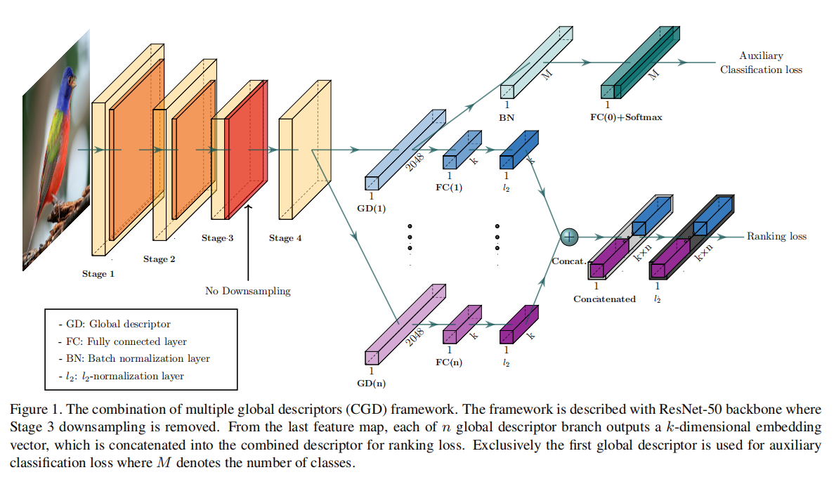 CGD由一个CNN主干网络和两个模块组成,第一个是主模块,由多个全局描述符组合而成,基于排序损失进行学习;第二个是辅助模块,通过微调分类损失进行训练。论文通过联合损失来训练整个网络,其实现由主模块的排序损失和辅助模块的分类损失求和得到。