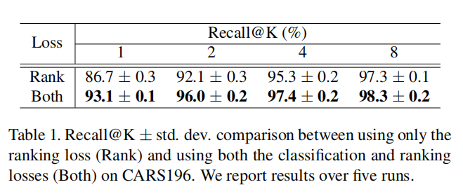 论文基于数据集CARS196比较了单独排序损失和结合分类损失一起训练的结果,如下表一所示: