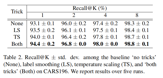论文同样实验了标签平滑和温度缩放对于性能的影响。使用ResNet-50作为主干网络,加上全局描述符组合SM(SPoC+MAC),实现结果如下表二所示: