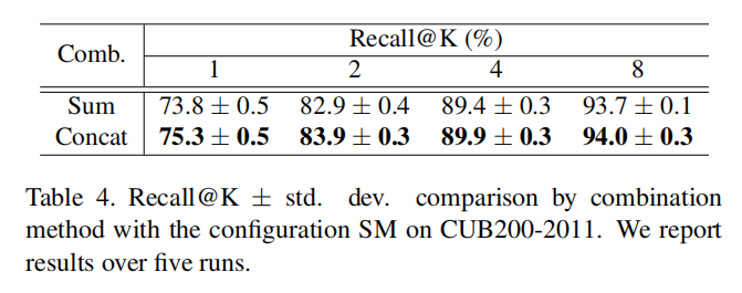 对于多个全局描述符组合,论文尝试了连接和求和两种方式。训练结果如下表所示:
