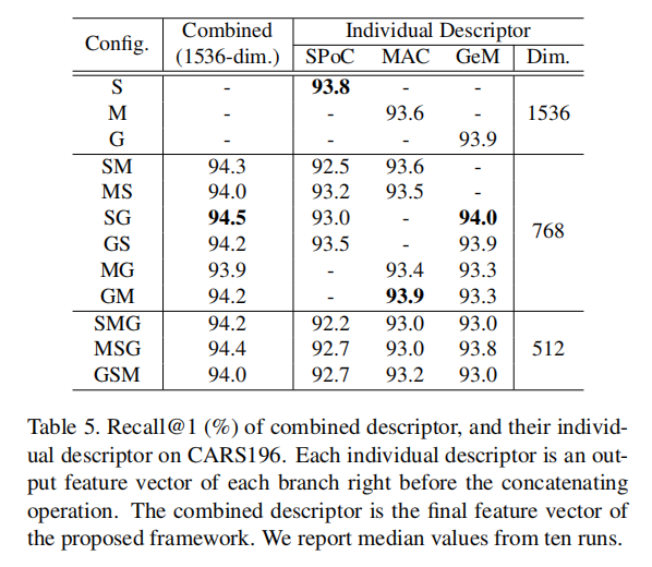 基于三个全局描述符SPoC(S)、MAC(M)、GeM(G),论文尝试了12种配置:S, M, G, SM, MS, SG, GS, MG, GM, SMG, MSG, GSM。其中,首字母对应的分支同时用于辅助模块的计算。