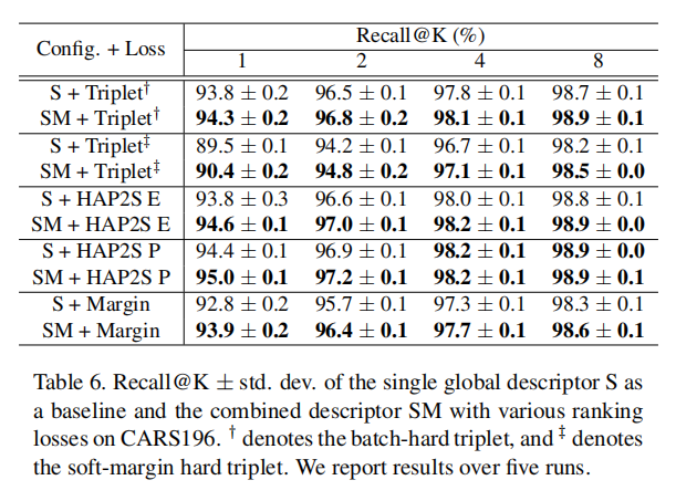 首先是使用独立的排序损失训练各个全局描述符(第一个分支还会额外训练一个分类损失);其次是将所有全局描述符组合在一起,经过FC层降维和L2归一化之后,使用一个排序损失进行训练(同样的,第一个分支会额外训练一个分类损失)。训练结果如下表所示: