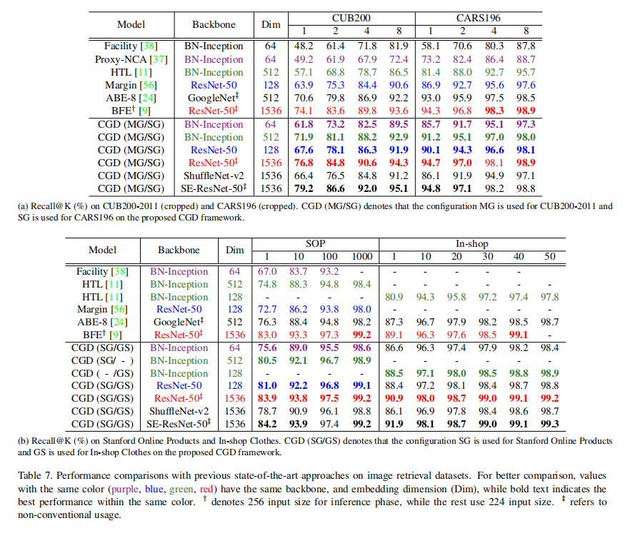论文实现了一个CGD框架,组合多个全局描述符(SPoC / MAC / GeM)以及组合多个损失(Softmax Loss / Rank Loss)参与训练,能够获取最好的检索性能。总的来说,这是一篇工程性质论文,给出了详细的实验结果以及架构配置。从实验数据来看,再一次证明了组合(combination)或者叫聚合(assemble)多个特征的方式能够有效提升性能(比对单个全局特征)。在PaperWithCode上可以发现,CGD在多个图像检索基准上实现了最优性能。