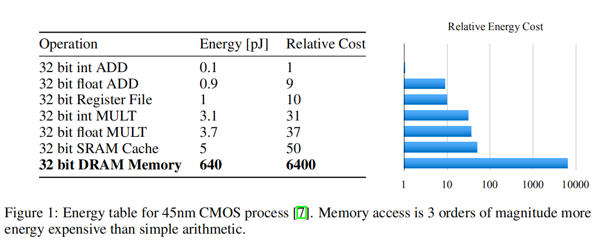 深度学习发展初期,大家还专注于开发更大参数的模型来实现更好的性能,这也约束了深度网络在嵌入式设备上的推广。论文展示了在45nm CMOS进程上进行基本运算和内存操作所耗费的能量