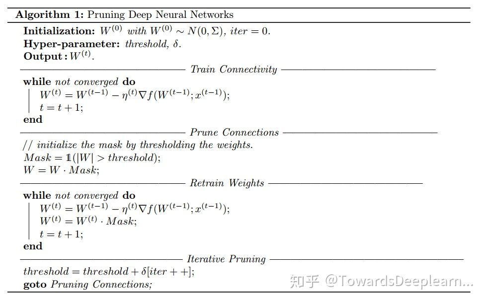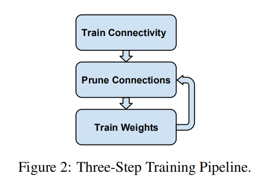 这篇大概是第一个提出通过3阶段(训练-剪枝-微调)来进行网络剪枝的论文了。相对于后续论文更加关注于计算量的评估,这篇论文把关注点放在了模型大小的压缩上(估计是因为常用运算库无法加速权重剪枝方法得到的稀疏矩阵),通过减少模型的存储大小,使得深度网络能够在嵌入式设备上有更好的推广。