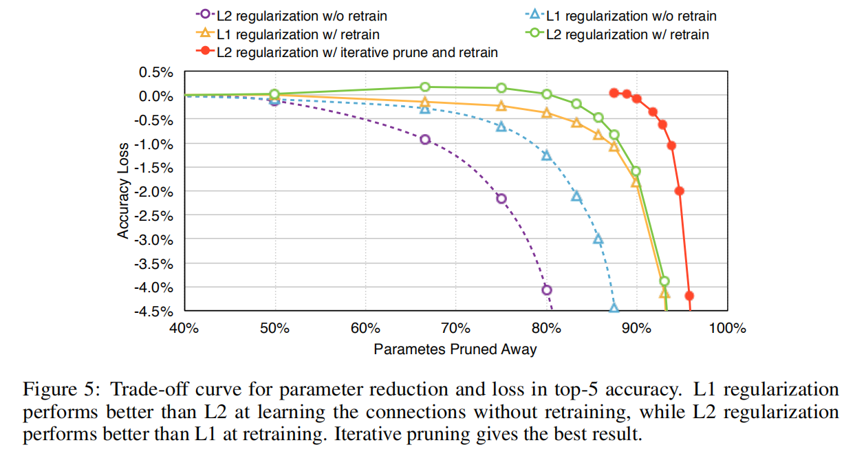 一次剪枝+重训练是一轮迭代,论文推荐进行多论剪枝训练。对于AlexNet,单轮剪枝能够实现5倍的模型缩放,而进行迭代剪枝能够达到9倍的模型缩放。