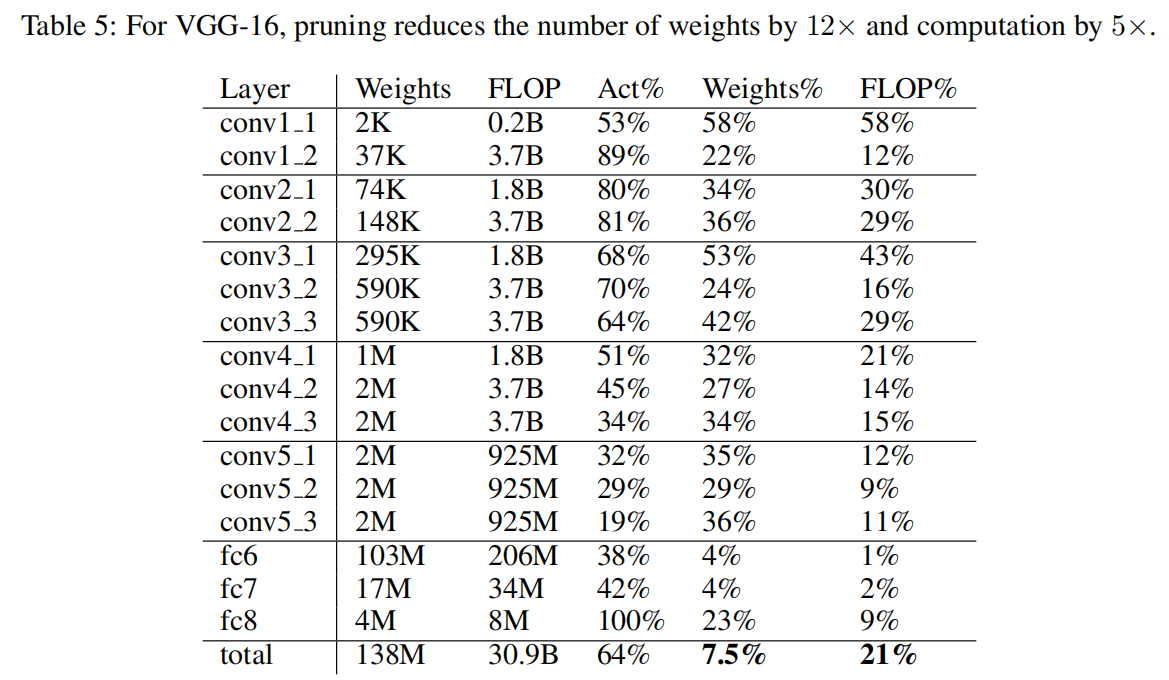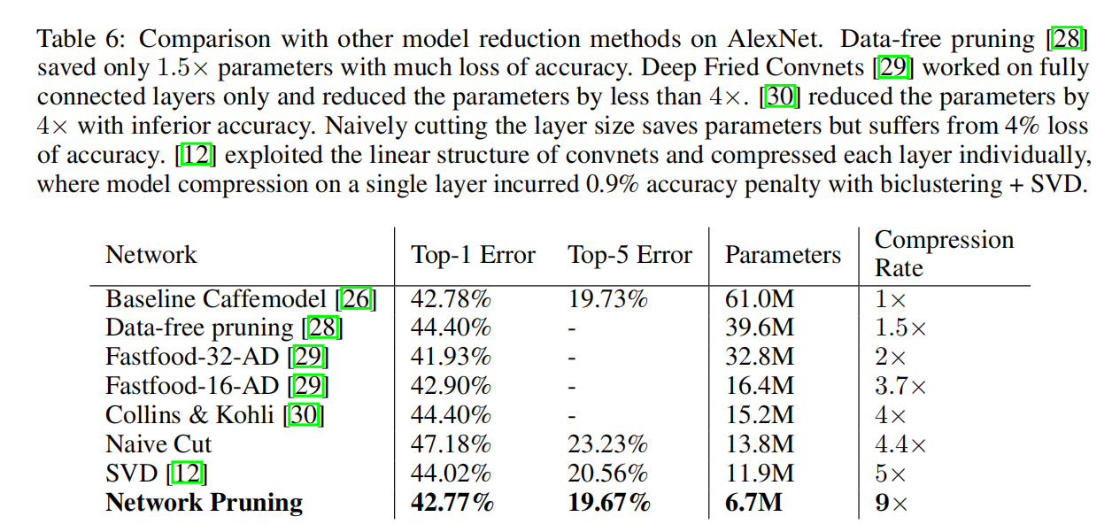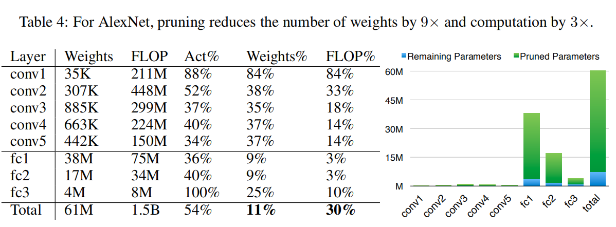 没看懂每列数值含义,反正最后一列显示AlexNet实现了9倍剪枝,VGGNet实现了12倍剪枝