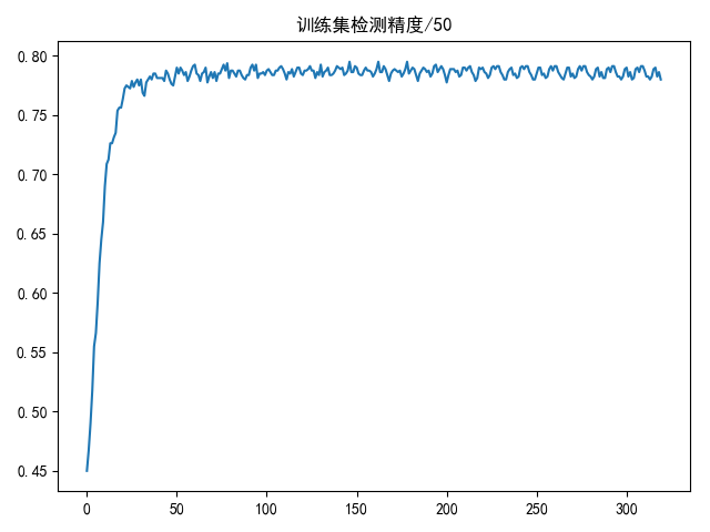 draw(loss_list, title='损失值/50') draw(accuracy_list, title='训练集检测精度/50') print(max(accuracy_list)) print(compute_predict_accuracy(logistic_regression(best_w, test_data), test_label))