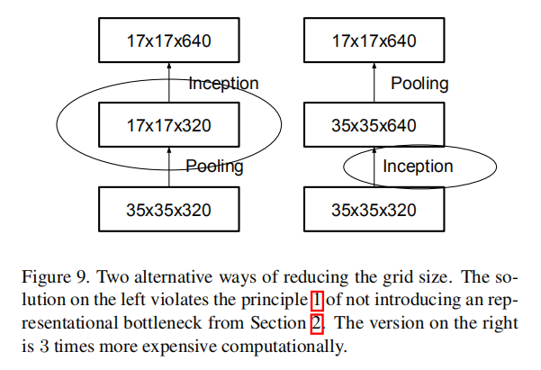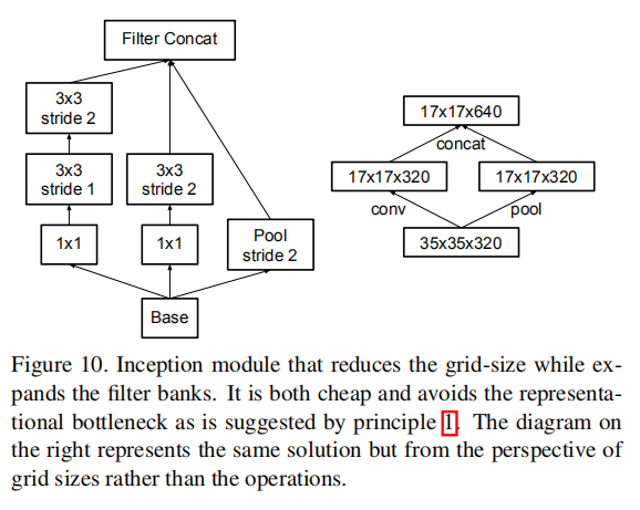 通常情况下,卷积网络使用池化层来缩减特征图的空间尺寸(网格大小)。为了避免表示能力瓶颈,在应用最大或平均池化之前需要扩展网络滤波器的激活维度。比如,对于