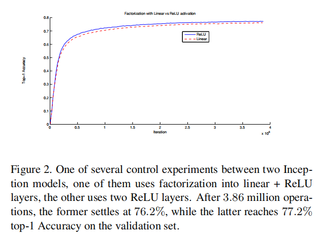 × reduction of computation, resulting in a relative gain of 28% by this factorization. The exact same saving holds for the parameter count as each parameter is used exactly once in the computation of the activation of each unit. Still, this setup raises two general questions: Does this replacement result in any loss of expressiveness? If our main goal is to factorize the linear part of the computation, would it not suggest to keep linear activations in the first layer? We have ran several control experiments (for example see figure 2) and using linear activation was always inferior to using rectified linear units in all stages of the factorization. We attribute this gain to the enhanced space of variations that the network can learn especially if we batchnormalize [7] the output activations. One can see similar effects when using linear activations for the dimension reduction components.