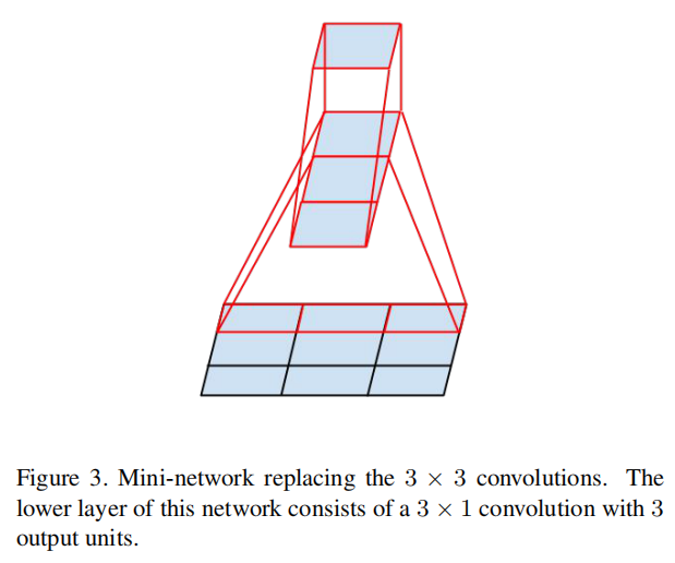 The above results suggest that convolutions with filters larger 3 × 3 a might not be generally useful as they can always be reduced into a sequence of 3 × 3 convolutional layers. Still we can ask the question whether one should factorize them into smaller, for example 2×2 convolutions. However, it turns out that one can do even better than 2 × 2 by using asymmetric convolutions, e.g. n × 1. For example using a 3 × 1 convolution followed by a 1 × 3 convolution is equivalent to sliding a two layer network with the same receptive field as in a 3 × 3 convolution (see figure 3). Still the two-layer solution is 33% cheaper for the same number of output filters, if the number of input and output filters is equal. By comparison, factorizing a 3 × 3 convolution into a two 2 × 2 convolution represents only a 11% saving of computation.