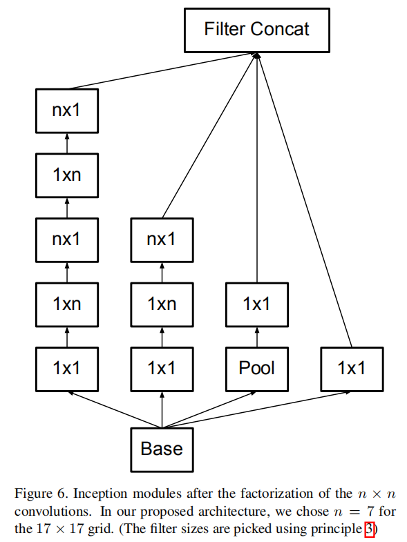 理论上,我们可以更进一步,认为可以用1 × n卷积,然后是n × 1卷积来代替任何n × n卷积,并且随着n的增加,计算成本节省会显著增加(见图6)。在实践中,我们发现使用这种因子分解在早期层上不能很好地工作,但是它在中等网格尺寸上给出了非常好的结果(在m×m的特征图上,其中m的范围在12和20之间)。在这个水平上,通过使用1 × 7卷积,然后是7 × 1卷积,可以获得非常好的结果