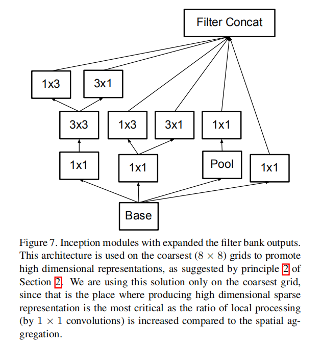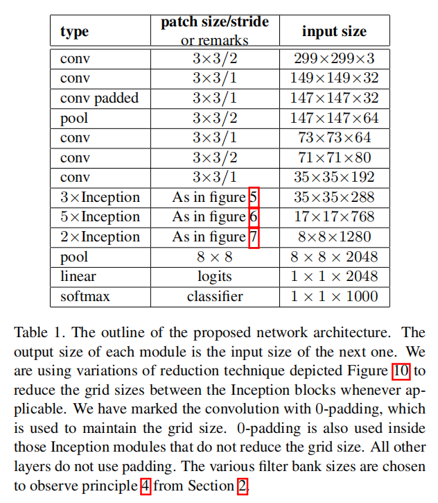 在这里,我们将从上面的观点联系在一起,并在ILSVRC 2012分类基准上提出一个新的具有改进性能的体系结构。我们网络的布局如表1所示。请注意,我们已经根据第3.1节中描述的相同思想,将传统的7 × 7卷积分解为三个3 × 3卷积。对于网络的Inception部分,我们在空间尺寸为35×35的时候有3个传统的Inception模块,每个模块有288个滤波器。使用第5节中描述的网格简化技术,这被简化为具有768个滤波器的17 × 17网格。接下来是5个分解的Inception模块实例,如图5所示。利用图10所示的网格简化技术,这可以简化为8 × 8 × 1280的网格。在最粗略的8 × 8级,我们有两个Inception模块,如图6所示,每个图块的级联输出滤波器组大小为2048。网络的详细结构,包括Inception模块中滤波器组的大小,在补充材料中给出,在本提交的tar文件中的model.txt中给出。然而,我们已经观察到,只要遵守第2节的原则,网络的质量对变化是相对稳定的。尽管我们的网络有42层深,但我们的计算成本仅比谷歌网络高2.5左右,而且它仍然比谷歌网络高效得多