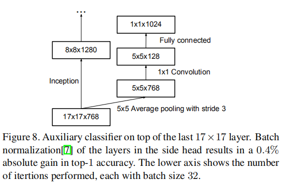 [20]在网络的不同阶段也使用了两个辅助分类器。移除较低的辅助分支对网络的最终质量没有任何不利影响。加上上一段中的早期观察,这意味着[20]关于这些分支有助于进化低级特征的最初假设很可能是错误的。相反,我们认为辅助分类器起着正则化的作用。支持这一点的事实是,如果辅助分支实现了批量归一化[7]或具有随机失活层,则网络的主分类器性能更好。这也为批量归一化充当正则化器的推测提供了一个弱支持证据