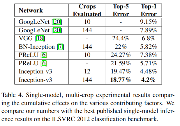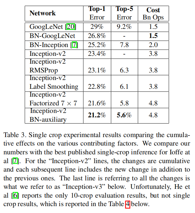 Table 3 shows the experimental results about the recognition performance of our proposed architecture (Inception-v2) as described in Section 6. Each Inception-v2 line shows the result of the cumulative changes including the highlighted new modification plus all the earlier ones. Label Smoothing refers to method described in Section 7. Factorized 7 × 7 includes a change that factorizes the first 7 × 7 convolutional layer into a sequence of 3 × 3 convolutional layers. BN-auxiliary refers to the version in which the fully connected layer of the auxiliary classifier is also batch-normalized, not just the convolutions. We are referring to the model in last row of Table 3 as Inception-v3 and evaluate its performance in the multi-crop and ensemble settings.