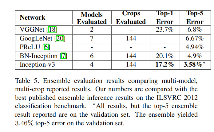 我们所有的评估都是在ILSVRC-2012验证集的48238个nonblacklisted示例上完成的,如[16]所建议的。我们也对所有50000个样本进行了评估,结果是前5名误差大约差0.1%,前1名误差大约差0.2%。在本文的下一个版本中,我们将在测试集上验证我们的集成结果,但是在我们最后一次评估BN-Inception的时候,[7]表明测试集和验证集的误差往往关联得非常好