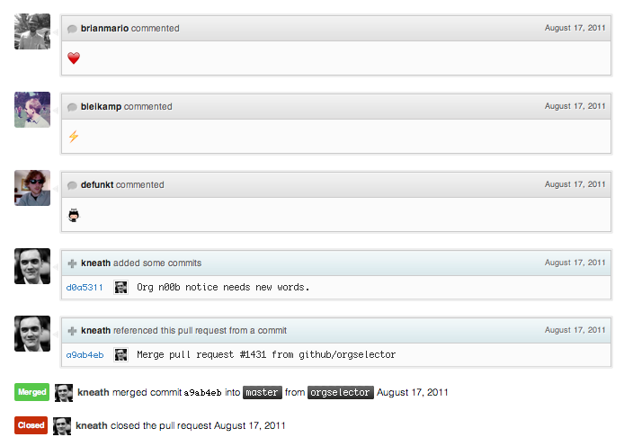This is cool because the Pull Request feature let’s you comment on individual lines in the unified diff, on single commits or on the pull request itself and pulls everything inline to a single conversation view. It also let you continue to push to the branch, so if someone comments that you forgot to do something or there is a bug in the code, you can fix it and push to the branch, GitHub will show the new commits in the conversation view and you can keep iterating on a branch like that.