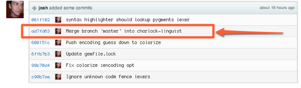 我们不只是直接在master上工作或者在主题分支上工作,当我们认为已经完成的时候,我们会把它合并进来 - 我们会试着从公司的其他人那里获得签名。这通常是+1或表情符号或“:shipit:”注释,但我们试图让其他人看它