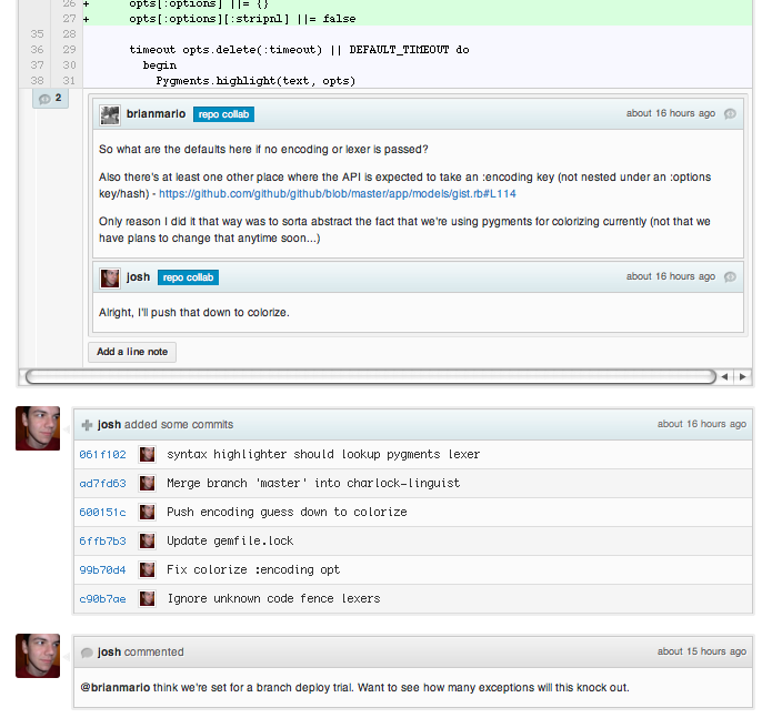 在这里,你可以看到乔什给布莱恩发了评论,布莱恩进来了,并对其中一行代码提出了一些建议。在更远的地方,我们可以看到乔希承认布赖恩的担忧,并推动更多的代码来解决它们