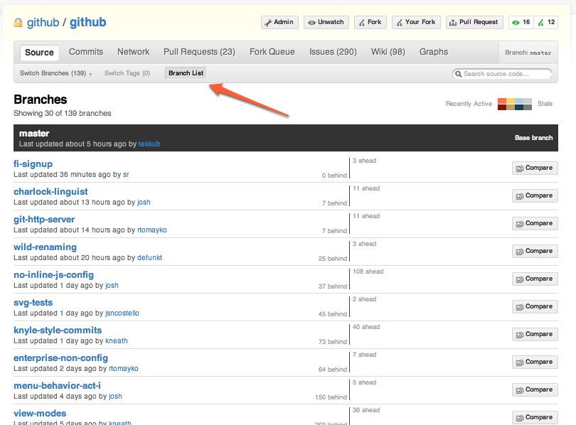 This is nice because when we go to the GitHub branch list page we can easily see what branches have been worked on recently and roughly how much work they have on them.