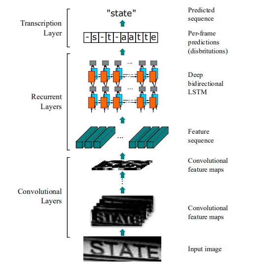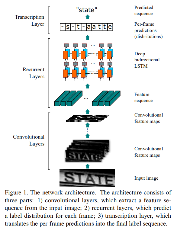 - 它拥有DCNN同样的特性,没有前处理步骤,包括字符归一化/字符分割,或者文本定位等(including binarization/segmentation, component localization, etc.),直接从图像数据中学习到有判别力的特征;
