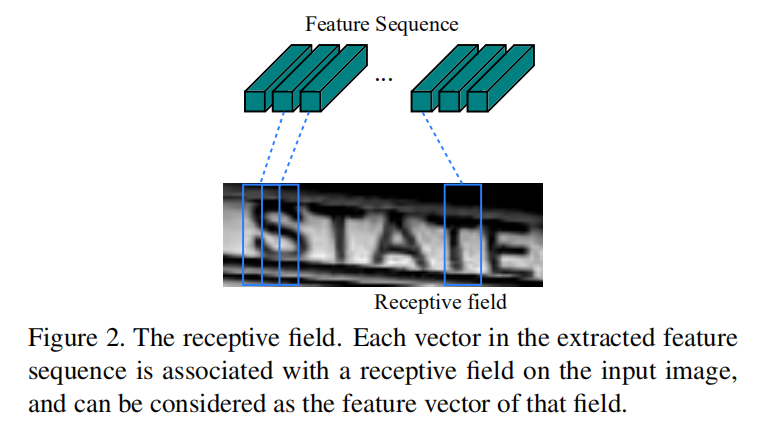 在CRNN的CNN模块中,使用卷积层和最大池化层进行构建,用于从输入图像中提取序列特征。因为卷积神经网络具有平移不变性(translation invariant)以及局部感受野(local receptive field)的特性,所以最后输出的特征序列中每一列特征向量可以看成是图像某一个局部区域的特征提取,也就是该区域的特征描述符(the image descriptor for that region)。