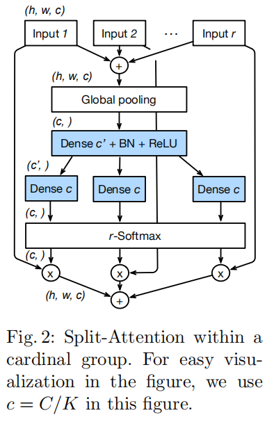 论文设计了一个基本计算单元:Split-Attention Block,用于对输入特征进行不同特征提取+跨通道特征融合。可为两步操作: