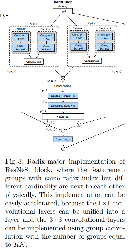基数组视角的布局如上图所示,在ResNeSt Block实现中,首先对输入特征进行分组,然后输入到各个Split-Attention Block中进行计算,完成后将各个分组特征串联在一起。