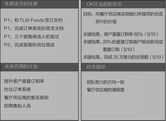 3-4件最重要的事情,只有本周完成了这几件事情,团队的目标才能向前推进;明确这些事情的优先级 OKR当前的状态:基础信心指数是5/10(就是50%,一半一半),每周根据上周完成情况进行修改,并讨论为什么会更高或更低- 未来四周的计划:有哪些事情需要其他团队成员做好准备或支持,都列在这个象限里