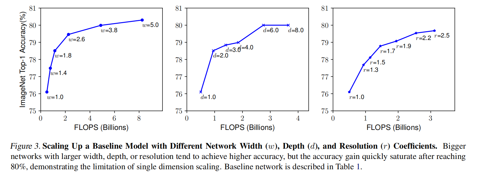 论文针对单一维度进行放大训练,发现单独放大任一维度(宽度、深度或者分辨率)均可以提升网络性能,但是放大模型越大,准确率增益会越小。