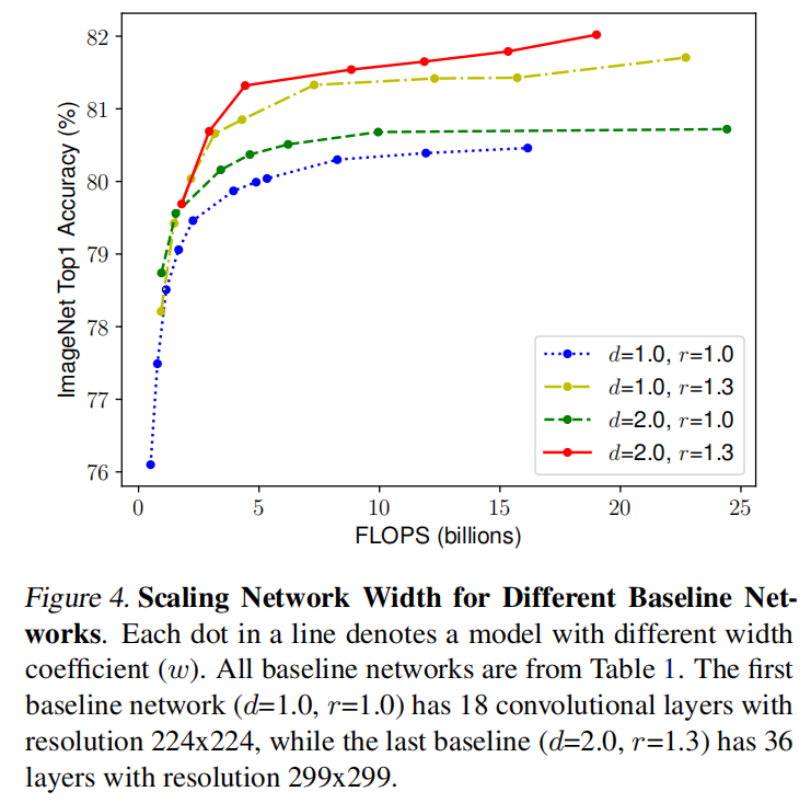 通常来说,卷积算子的FLOPS与FLOPS,加倍网络宽度或者分辨率将增加4倍FLOPS。卷积运算通常在网络中占主导地位,所以上述复合缩放公式将等比例的近似增加FLOPS。论文限定了FLOPS。