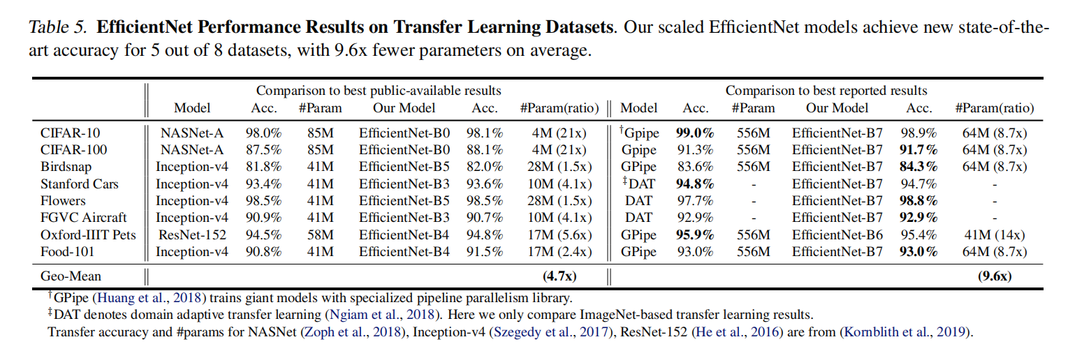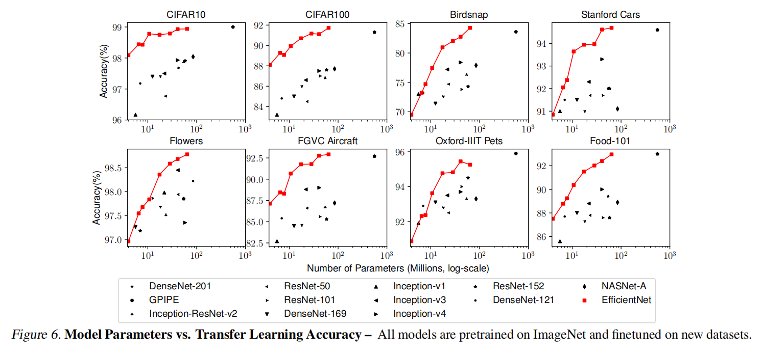 To go even further, we use neural architecture search to design a new baseline network and scale it up to obtain a family of models, called EfficientNets, which achieve much better accuracy and efficiency than previous ConvNets. In particular, our EfficientNet-B7 achieves state-of-the-art 84.3% top-1 accuracy on ImageNet, while being 8.4x smaller and 6.1x faster on inference than the best existing ConvNet. Our EfficientNets also transfer well and achieve state-of-the-art accuracy on CIFAR-100 (91.7%), Flowers (98.8%), and 3 other transfer learning datasets, with an order of magnitude fewer parameters. Source code is at this https URL.