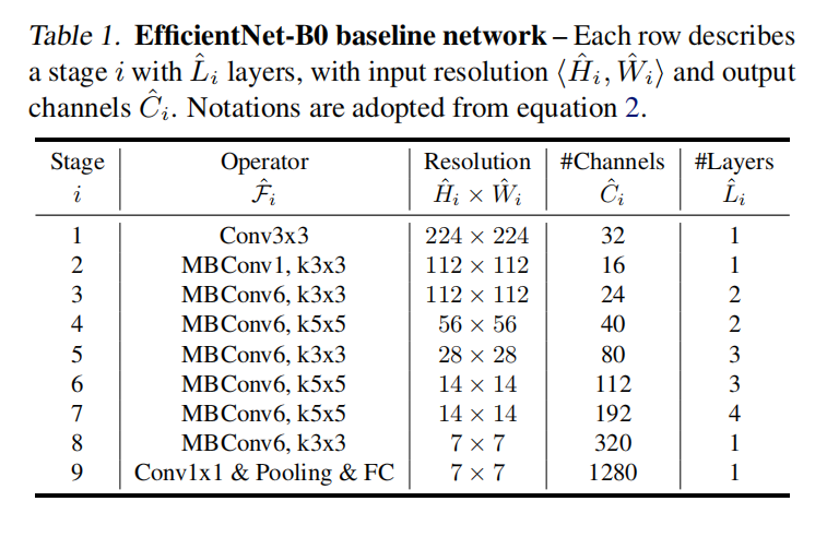 论文通过神经架构搜索算法创造了一个新的基准模型 - EfficientNet-B0。它主要由反向残差块MBConv构成,同时增加了SE注意力层。整体架构如下: