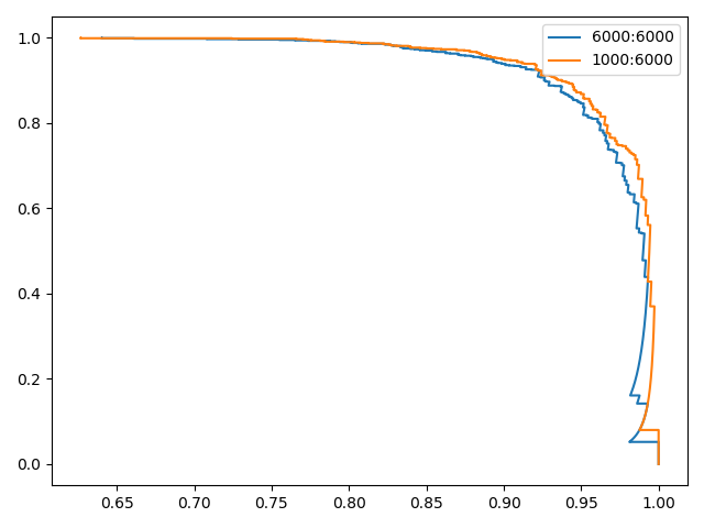 从结果可知,PR曲线同样能够在类别数目不平衡的情况下有效的评估分类器性能