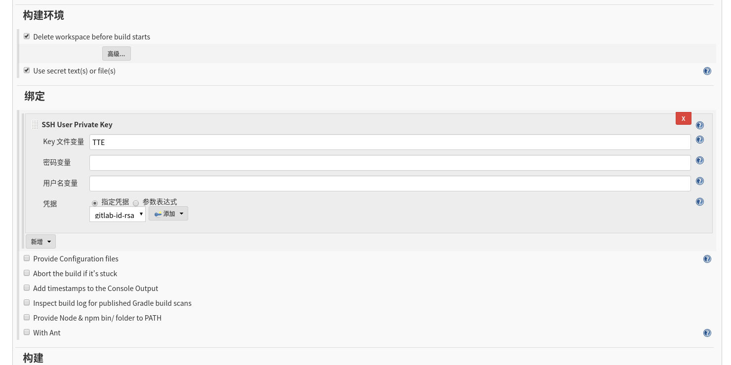 新建Freestyle工程,在配置 -> 构建环境类别中选择Use secret text(s) or files(s),新增一个SSH User Private Key