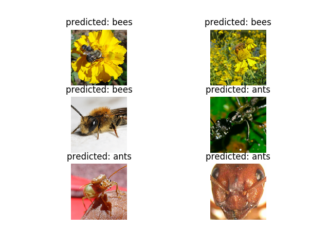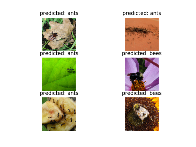 data_dir = 'data/hymenoptera_data' image_datasets = {x: datasets.ImageFolder(os.path.join(data_dir, x), data_transforms[x]) for x in ['train', 'val']} dataloaders = {x: torch.utils.data.DataLoader(image_datasets[x], batch_size=4, shuffle=True, num_workers=4) for x in ['train', 'val']} dataset_sizes = {x: len(image_datasets[x]) for x in ['train', 'val']} class_names = image_datasets['train'].classes