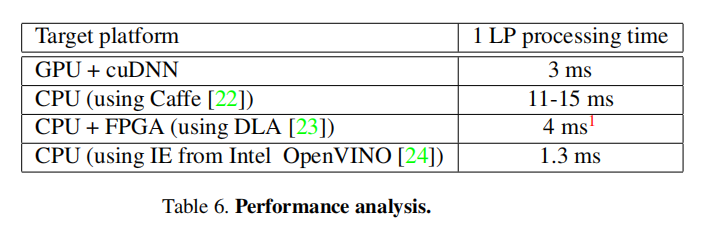 论文测试了LPRNet在不同硬件平台上的推理速度,包括CPU、GPU和FPGA。