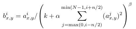 经过ReLU激活后的卷积图,第i层上的位置为(x,y)的神经元值a,需要除以其相邻n个层相同位置的神经元值之和。常量k,n,